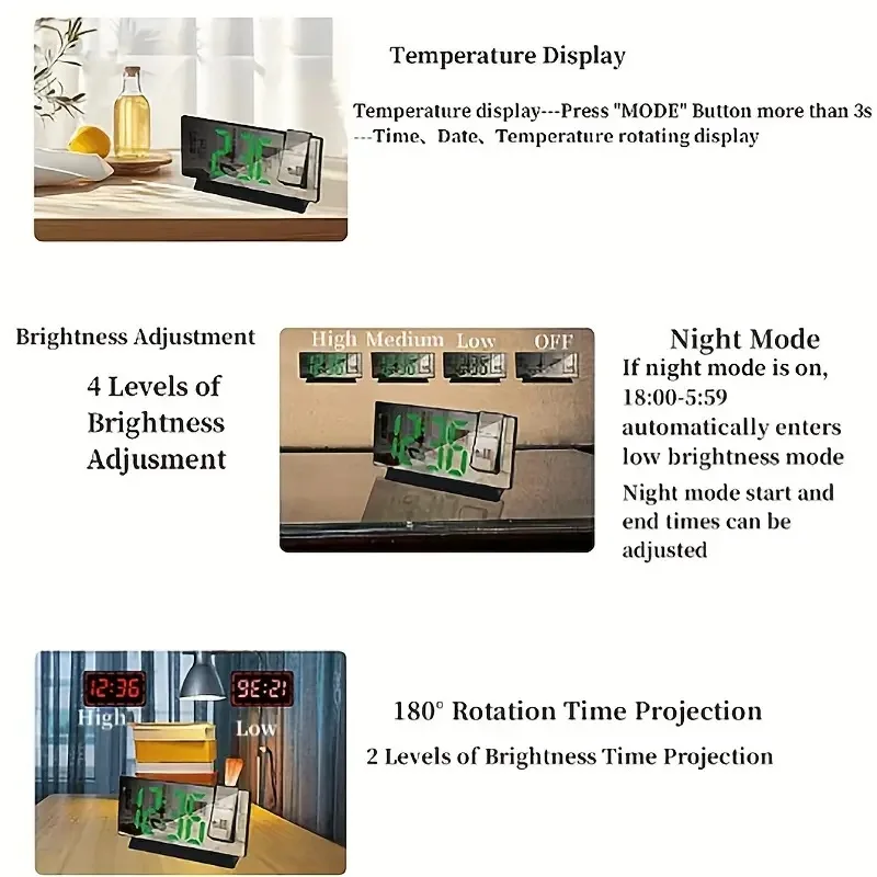 Funções: função de relógio, função de data, função de despertador, função de temperatura, seleção de modo de exibição, função de economia de energia, função automática de meia luz, função de relógio de projeção LCD