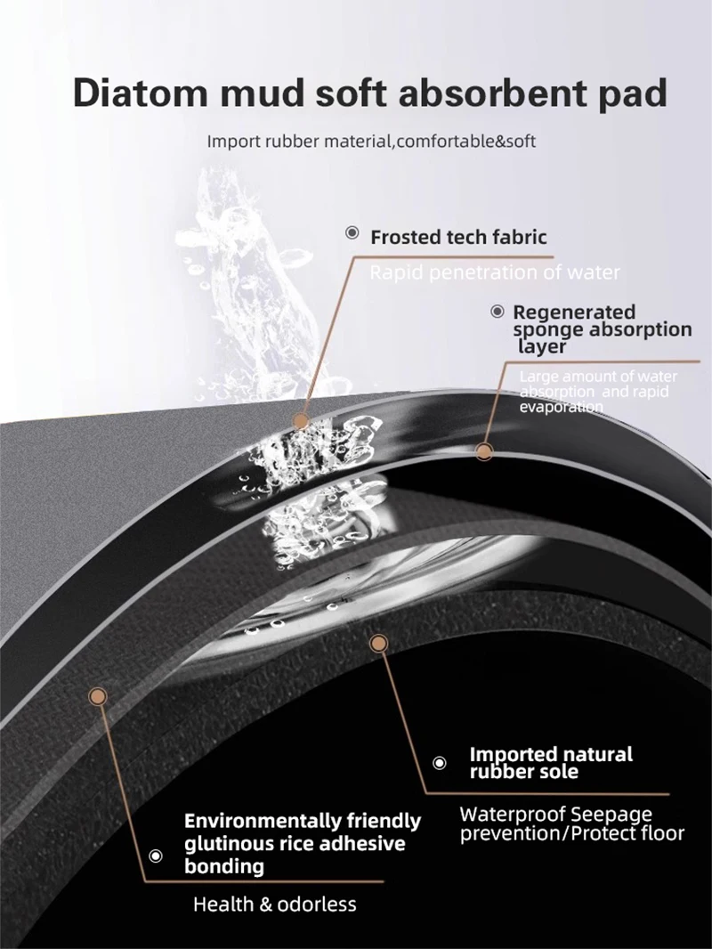 1. feito de tecido de lama de diatomáceas de alta qualidade + esponja + borracha, macio, confortável, agradável à pele, ambiental, durável, reutilizável, antibacteriano, antiderrapante